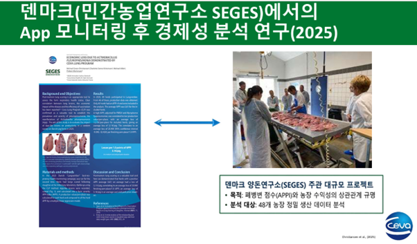 2025년 덴마크 민간 농업연구소 SEGES에서는 CLP를 통해 흉막폐렴과 비육 농장의 수익성을 분석했다. 분석에 따르면 흉막폐렴 지수가 높아질수록 생산 가치가 낮아지는 경향이 확인되었으며, 지수 1.0 증가당 두당 평균 5.10유로의 손실이 발생하는 것으로 분석되었다. 이는 흉막폐렴 병변이 단순한 병리 소견에 그치지 않고, 실제 농장 수익성과도 밀접하게 연결될 수 있음을 보여준다.