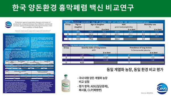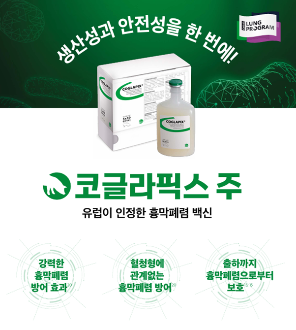 국내에서도 동일한 환경과 사양 조건에서 흉막폐렴 백신만 달리 적용해 비교한 흥미로운 연구가 보고된 바 있다. 이 자료에서 코글라픽스 접종군은 폐사율이 가장 낮았고, 일당증체량은 가장 높았으며, CLP 평가에서 확인된 흉막폐렴 지수 역시 0.13으로 가장 낮게 나타났다. 물론 이 결과만으로 모든 농장에 동일한 결론을 곧바로 적용하기는 어렵다. 다만 백신 선택이 실제 현장 성적과 폐병변 수준에 의미 있는 차이를 만들 수 있다는 점에서는 충분히 참고할 만한 자료라고 생각된다.