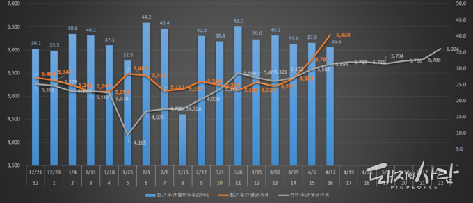 가장 주목할 점은 4월 돼지 도매가격(제주 및 등외 제외) 전망치의 상향 조정입니다. 협회는 당초 예상치(5,500~5,700원/kg)에서 300원씩 높여 잡았습니다. 4월 들어 눈에 띄게 감소한 출하두수 영향으로 풀이됩니다(관련 기사).