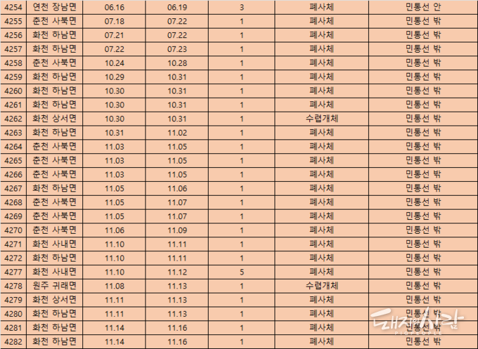 - 강원 19건: 화천 4(상서면/'20.10.9/10.10, 하남면/'23.09.25, 사내면/'24.10.13), 영월 1(주천면/'21.5.5), 고성 1(간성읍/'21.8.8), 인제 2(인제읍/'21.8.16, 남면/'21.10.6), 홍천 3(내촌면/'21.8.26, 화촌면/'22.5.26, 남면/'24.11.03), 양구 1(국토정중앙면/22.8.18), 춘천 2(동산면/22.9.19/9.20), 철원 4(동송읍/'22.11.09, 동송읍/'23.1.11, 갈말읍/'23.7.18/'24.5.21), 양양 1(손양면/'23.2.12)