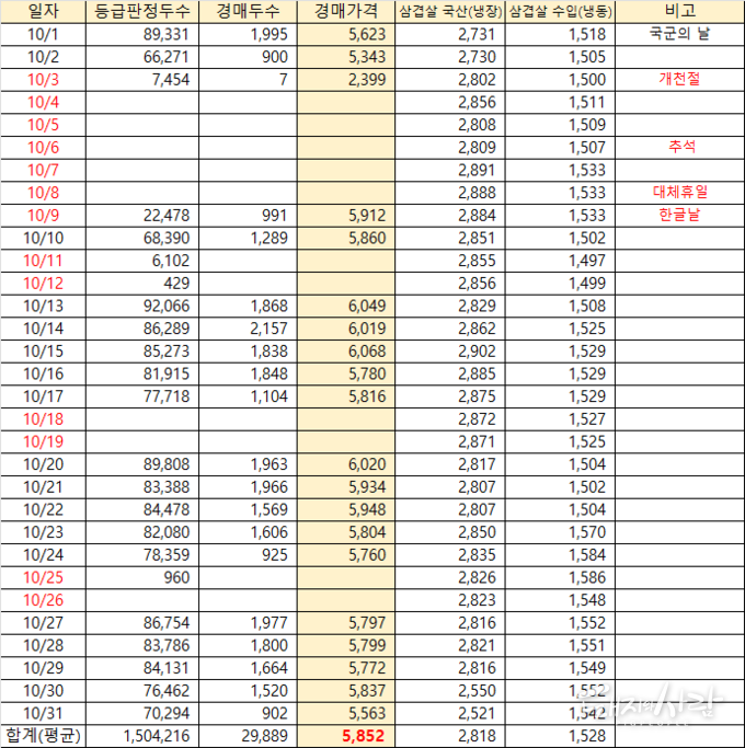 ※ 10월 10일자 주간 돼지고기 시황(출처 한국육류유통수출협회)