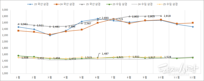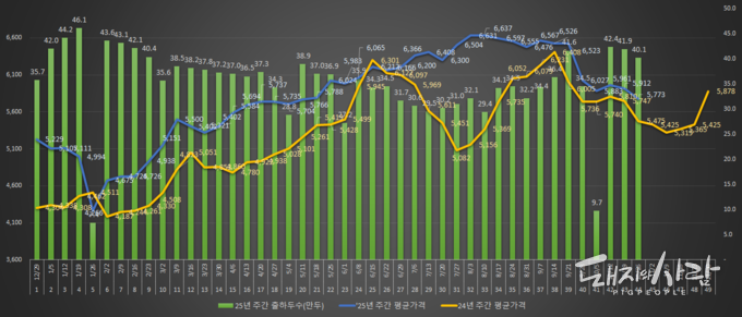 ☞2024년과 2025년 주차별 평균 돈가('24년은 같은 기간)