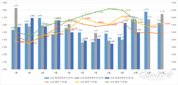 ☞월별 등급판정두수(단위 천두) 및 평균 가격(단위 원)@돼지와사람 편집