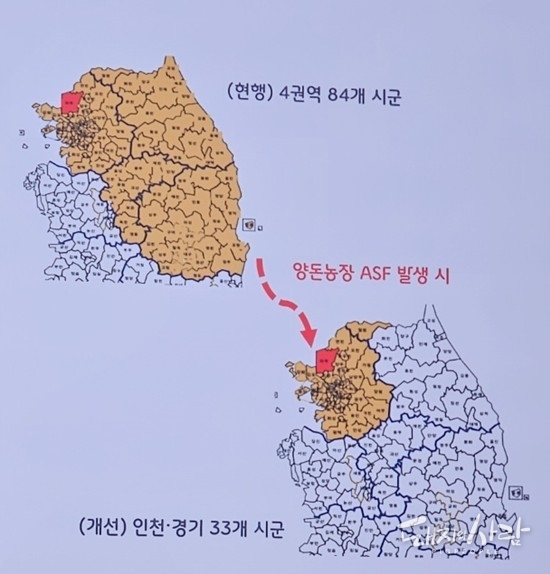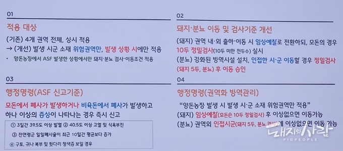 설명회에서 농식품부 관계자는 ASF와 관련해 먼저 권역화 적용 및 돼지·분뇨 이동 및 검사 기준 개선 방안을 소개했습니다.