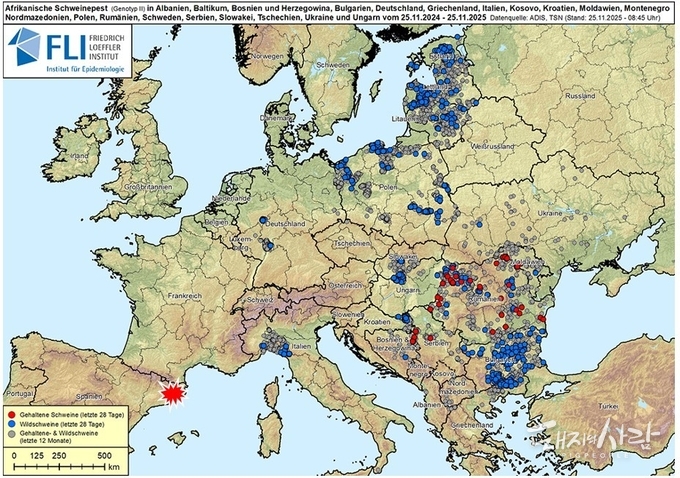 한편 스페인 현지 보도에 따르면 이번 스페인의 감염멧돼지 발생은 바이러스에 오염된 음식이 원인으로 지목되고 있는 가운데 감염멧돼지 숫자는 현재까지 모두 8건(마리)로 늘어났으며, 14건의 의심사례에 대해 검사가 진행 중인 것으로 알려졌습니다.