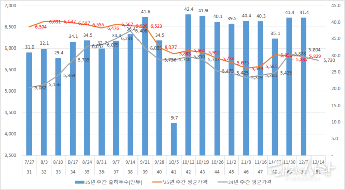 지난주(12.7~13) 돼지 평균 도매가격(제주 및 등외 제외, kg당)은 전주(5,837원)보다 8원(-0.1%) 떨어진 5,829원을 기록해 2주 연속 보합세를 이어갔습니다. 전년 동기(5,804원)와 비슷한 수준을 유지했습니다. 관련해 한국육류유통협회에 따르면 국내산은 대형·중소마트 할인행사와 연말 수요로 삼겹살 덤핑물량이 줄었지만, 목심 소비는 심각한 부진 상황이고 김장·외식 수요 위축으로 전지·등심·후지는 약보합세였습니다. 수입산의 경우 구이용 냉장육은 공급 감소로 부족 현상을 보인 반면, 냉동육은 수요 부진과 공급 증가 영향 속에 보합세를 유지했습니다. 현재(13일 누적 기준)까지의 12월 평균 도매가격은 5,834원입니다. 지난달 평균(5,657원)보다 3.1% 올랐습니다. 4개월 만에 하락에서 상승으로 뚜렷하게 전환했습니다.