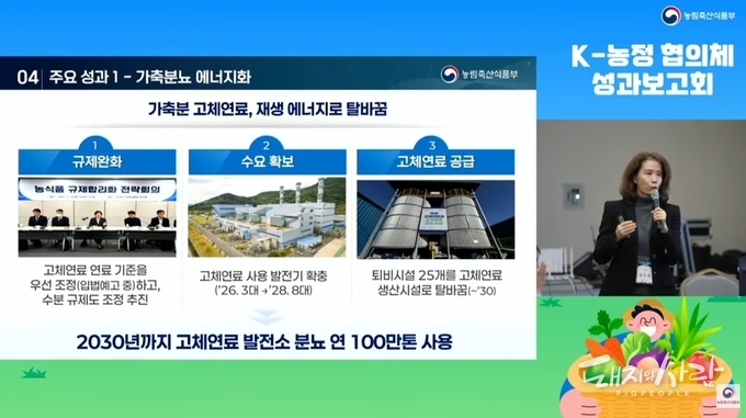 축산소분과에서는 ‘가축분뇨 에너지화’를 위해 고체연료 품질 기준 조정 등 규제 개선, 고체연료 수요 확보 및 생산설비 증축을 중점 추진하기로 하였습니다. 고체연료 기준(발열량, 제형, 보조원료 등)을 우선 조정하였고, ’26년 수분 추가 조정에 나섭니다. 고체연료 사용 발전소를 ’26년 3대에서 ’28년 8대까지 확충하고, ’30년까지 연간 100만 톤의 분뇨를 발전소를 통해 처리한다는 목표입니다.