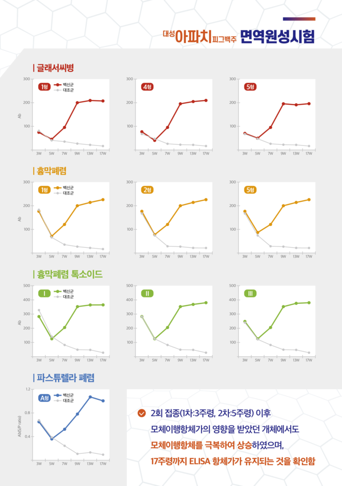 • 호흡기 질병 원인체 7가지와 흉막폐렴 재조합 톡소이드(Apx I,II, III)로 구성