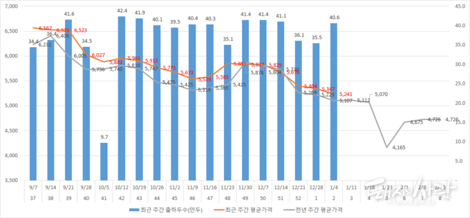 코스피가 새해에도 상승하며, 역대 신기록을 연신 갈아치우고 있습니다. 반면, 돈가는 끝모를 추락 중입니다. 축산물품질평가원에 따르면 지난주(1월 4~10일) 돼지 도매가격(제주 및 등외 제외, kg당)은 전주(5,347원)보다 106원(2.0%) 떨어진 5,241원을 나타냈습니다. 어느새 6주 연속 하락하며 5,200원대까지 주저앉았습니다. 관련해 한국육류유통수출협회는 12일 주간시황에서 '국내산 구이류의 경우 비수기와 강추위로 외식 소비가 위축되고, 대형·중소마트 할인행사에도 가정수요가 살아나지 않으면서 덤핑과 냉동생산이 심화됐다'라고 전했습니다. 이어 '정육류의 경우 전지는 급식납품 휴지기에 접어들면서 약세이고 후지는 원료육 수요로 보합, 갈비는 설 수요가 본격화되지 않아 보합세였다'라고 덧붙였습니다. 한편 정부는 이달 8일부터 돼지고기 물가안정을 위해 전국 9개 대형마트, 슈퍼마켓 1천여개 지점 및 농축협 하나로마트에서 최대 30%까지 할인을 실시한다고 최근 밝혔습니다(관련 기사).