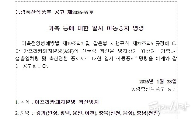 [2보] 경기도동물위생시험소 정밀검사 결과 안성 의심축은 최종 ASF로 진단되었습니다. 지난 17일 강릉에 이어 6일 만에 추가 양성 사례입니다. 방역당국은 23일(금) 오후 6시부터 25일(일) 오후 6시까지 48시간 동안 경기 안성과 인접 6개 시군(경기 평택·용인·이천, 충북 진천·음성, 충남 천안)의 양돈농장·도축장·사료공장 등 축산관계시설 종사자 및 차량에 대하여 일시이동중지 명령을 내렸습니다. 이번 안성 발생농장 반경 10km 내(방역대)에는 모두 38개 양돈장에서 돼지 8만여 마리를 사육 중입니다.