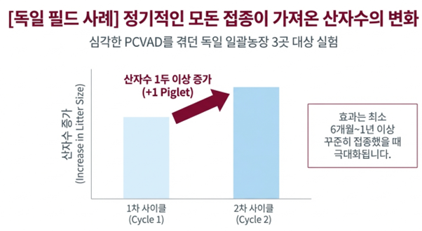 모돈 PCV2 백신 접종 후 첫 번째 번식 사이클에서도 성적 개선이 확인되었으나, 두 번째 사이클에서는 산자수가 1두 이상 증가하는 비약적인 효과를 보였다. 이는 모돈 접종이 일회성 조치가 아닌, 정기적으로 시행될 때 효과가 '복리'처럼 누적됨을 시사한다. 건강한 모돈이 생산한 강건한 자돈은 농장 내 전체 바이러스 부하(Viral load)를 감소시키며, 이는 다시 전 돈군의 건강을 증진하는 선순환 구조를 형성한다. 전문가들은 육성-비육 구간의 증상을 효과적으로 제어하기 위해 최소 6개월에서 1년간 모돈 접종을 지속할 것을 강조하고 있다.