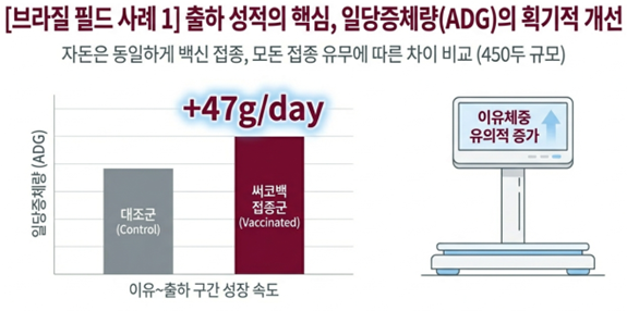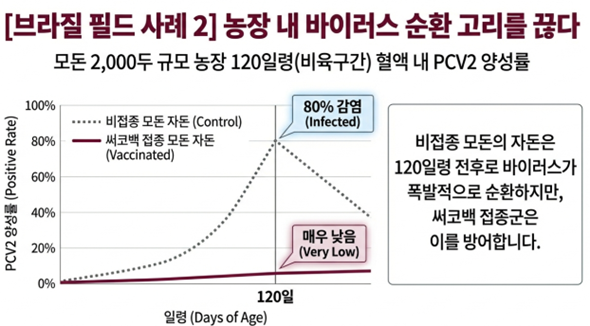 브라질에서 수행된 농장 시험에 따르면, PCV2 백신을 접종한 모돈에서 태어난 자돈은 비접종군 대비 이유체중 증가, 일당증체량 47g 개선, 비육 단계 폐사율 감소 등 뚜렷한 지표 개선을 보였다. 특히 모체이행항체에 의한 자돈 백신 간섭 현상은 관찰되지 않았으며, 오히려 모돈 백신을 접종하지 않은 대조군에서는 120일령 검체의 약 80%가 PCV2 양성으로 확인되었다. 이는 모돈 접종이 농장 전체의 바이러스 순환을 억제하고 안정적인 방어 체계를 구축하는 데 필수적인 전략임을 입증한다.