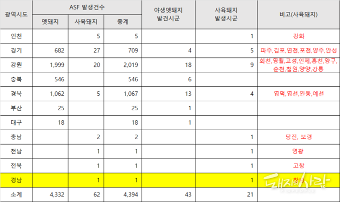 최근 농장서 발생한 사례 중 포천(58차)과 강릉(56차)을 제외한 대부분이 기존 바이러스 검출 지역이 아닌 곳에서 터졌습니다. 안성(57차, 경기 이남)을 시작으로 영광(59차, 전남 최초), 고창(60차, 전북 최초), 보령(61차, 충남 이남 최초), 그리고 창녕(62차, 경남 최초)까지 ASF 전선이 전국으로 넓어지고 있습니다. 이로써 2019년 9월 국내 첫 발생 이후 전국 17개 시도 가운데 11개 시도가 ASF 바이러스로 더럽혀지는 이력을 남겼습니다. 제주를 제외한 육지의 모든 광역도(8개도)가 ASF의 사정권에 들어갔습니다.