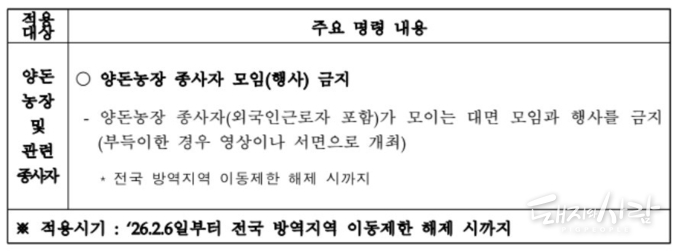 이에 따라 외국인 근로자를 포함한 모든 양돈농장 종사자는 전국 방역지역의 이동제한이 해제될 때까지 대면 모임이나 행사를 가질 수 없습니다. 부득이한 경우에는 반드시 영상이나 서면으로 대체해야 합니다. 이를 위반할 경우에는 관련 법령에 따라 1년 이하의 징역 또는 1천만원 이하의 벌금에 처해질 수 있습니다.