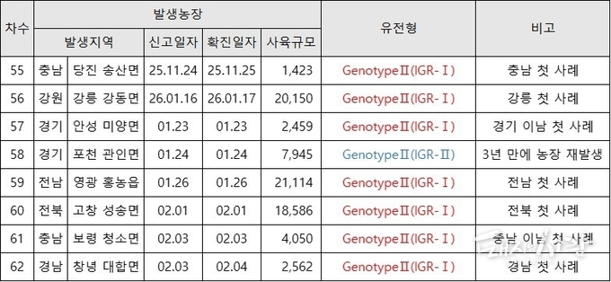 이번 확산 사태에서 가장 눈에 띄는 점은 바이러스의 유전형입니다. 경기 포천을 제외한 강릉, 안성, 영광, 고창, 보령, 창녕 등에서 검출된 바이러스는 국내에서 흔히 발견되던 IGR-II나 IGR-III형이 아닌 IGR-I형으로 확인됐습니다.
