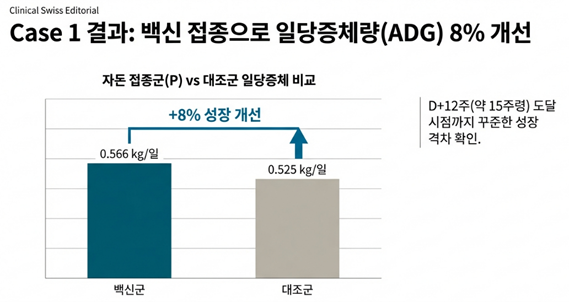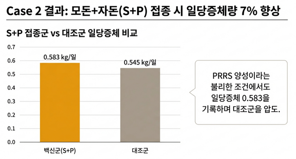 본 실증 자료에서 모돈+자돈(S+P) 접종이 적용된 농장은 PRRS 양성 상태로 지속적인 질병 압력이 존재하는 환경이었다. 이러한 조건에서도 접종군은 대조군 대비 일관된 성장 우위를 보이며, 높은 질병 부담 상황에서도 기초 면역 관리의 효과가 유지될 수 있음을 확인하였다.