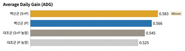 평균 일당증체량(ADG)은 S+P 접종군 0.583kg으로 대조군(0.545kg) 대비 약 7% 개선되었으며, PRRS 양성 환경에서도 안정적인 성장 우위를 보였다. 이 결과는 모돈 단계부터 형성된 면역 기반이 자돈의 성장 안정성에 추가적인 이점을 제공하며, 고질병 압력 환경에서 통합 면역 관리의 필요성을 시사한다.