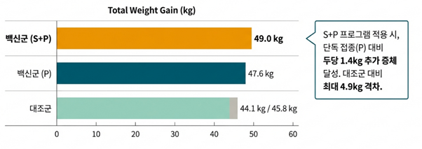 경북 소재 PRRS 양성 농장에서 모자돈 60두를 대상으로 모돈+자돈 접종군(S+P)과 자돈 단독 접종군(P) 및 대조군의 성장 성적을 비교하였다. 12주 후 총 증체량은 S+P 접종군 49.0kg으로, 자돈 단독 접종군(47.6kg) 대비 약 1.4kg, 대조군(44.1~45.8kg) 대비 최대 3~4kg 이상의 차이가 확인되었다.