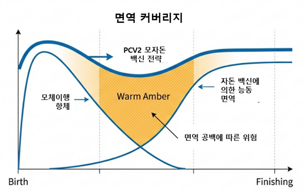 이러한 격차는 모돈 단계에서 형성된 면역 수준과 자돈으로 전달되는 모체이행항체의 질적 차이와 관련된 것으로 해석될 수 있다. 모돈의 면역 상태가 안정적으로 유지될 경우, 자돈의 초기 감염 시기를 지연시키고 PRRS 등 면역 억제 환경에서도 PCV2 감염 부담을 낮추는 효과가 기대된다. 따라서 모돈과 자돈을 연계한 통합 면역 관리는 PRDC 발생 위험을 감소시키는 중요한 관리 요소로 고려될 수 있다.