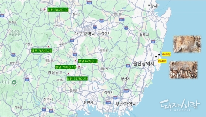 특히 주목할 점은 이번 울산 멧돼지 포획지점이 기존의 바이러스 검출 지역들과 상당한 거리를 두고 있다는 사실입니다. 최근 발생했던 경남 창녕의 70차 발생농장과는 약 80km, 지난해 12월 경북 안동의 감염멧돼지(4310, 관련 기사) 발견지점과는 무려 130km나 떨어져 있는 고립된 위치입니다.