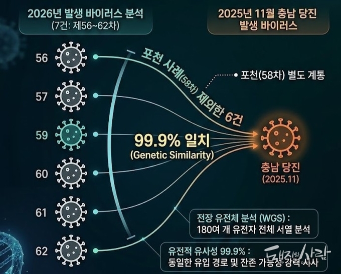 이번 분석 결과는 지난해 당진 바이러스가 사멸되지 않고 잔존해있다 재확산되었거나, 특정 동일 경로를 통해 전국적으로 퍼지고 있음을 시사합니다. 사태 초기 제기된 '해외불법축산물 혹은 외국인근로자, 국제택배에 의해 새로운 바이러스가 국내로 유입되어 발병했을 가능성'은 현저히 낮음을 의미합니다.