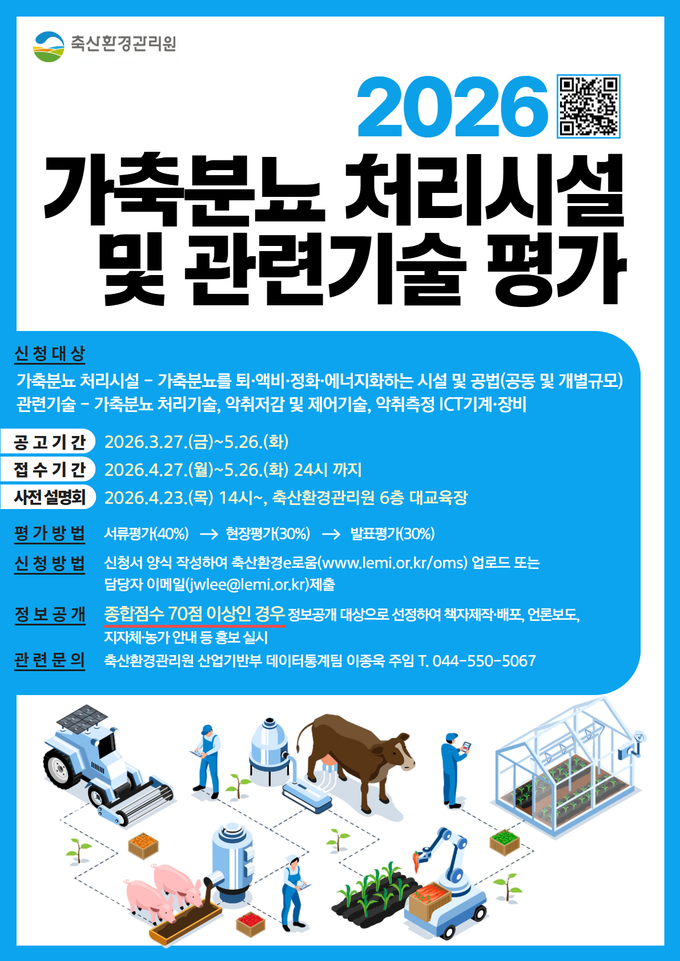 축산환경관리원(원장 문홍길)은 3월 27일부터 5월 26일까지 ‘2026년 가축분뇨 처리시설 및 관련기술 평가 계획’을 공고하고, 오는 4월 27일부터 신청 접수를 진행한다고 밝혔습니다.