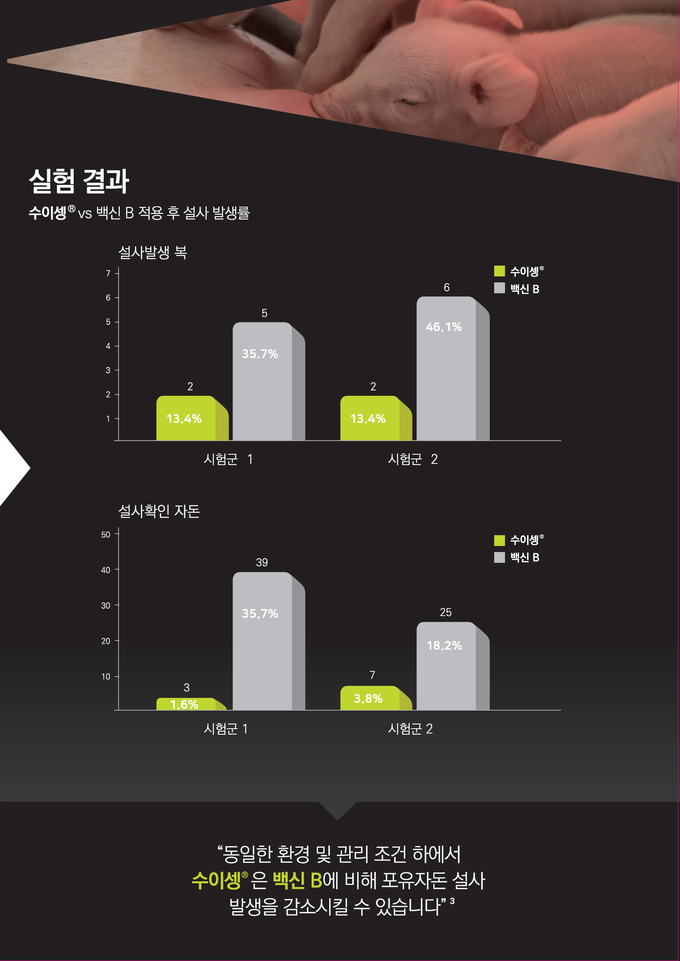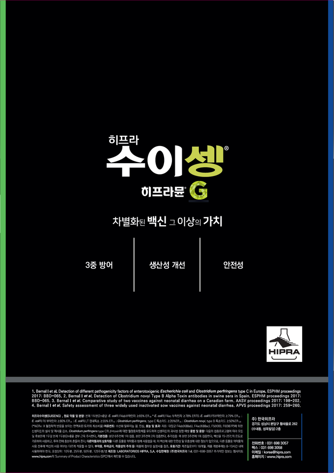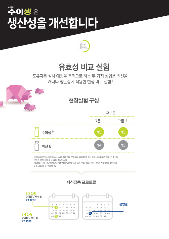'수이셍®'은 그 이상의 가치를 약속합니다. 포유자돈 설사와 노비균에 의한 모돈 급사를 예방하는 3중 방어를 제공합니다. '수이셍®'은 혁신적인 어쥬번트 '히프라뮨®G'가 적용되어 유일하게 3중 방어를 제공할 수 있는 백신입니다.