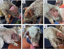 삼출성 표피염(Exudative epidermitis, EE), 즉 ‘기름진 돼지병(greasy pig disease)’은 주로 박리독소(exfoliative toxins, ETs)를 생성하는 독소성 Staphylococcus hyicus 균주에 의해 발생하며, 이 독소는 돼지의 '데스모글레인-1(desmoglein-1; 피부 세포를 서로 단단히 붙잡아 주는 접착 단백질)'을 표적으로 작용해 어린 돼지에서 특징적인 피부 병변을 유발한다. 다른 국가에서는 Staphylococcus chromogenes와 Staphylococcus sciuri 등 비-hyicus 포도상구균도 EE 임상 사례와 연관된 것으로 보고된 바 있으나, 국내에서는 이러한 사례가 보고된 적이 없다. 본 연구에서는 산발적 발생(농장 A)과 상재적 발생(농장 B)을 보이는 국내 두 양돈농장을 대상으로 EE의 원인 세균을 규명하기 위해 조사하였다. 총 6개의 조직 스크래핑 시료(농장 A 2건, 농장 B 4건)에서 5종의 포도상구균이 분리되었으며, 각각 Staphylococcus chromogenes(n=3), Staphylococcus haemolyticus(n=3), Staphylococcus