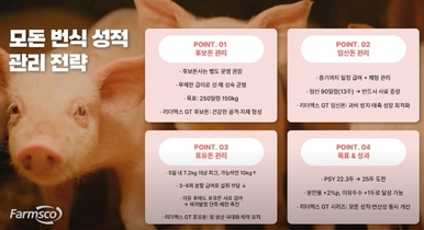 PSY 25두는 적절한 사양관리뿐만 아니라 번식돈 단계별 적정 사료프로그램 적용으로 달성이 가능합니다. 후보돈의 경우 후보돈사를 별도로 운영하며, 무제한 급이로 충분힌 성성숙·체성숙을 할 수 있도록 도웁니다. 팜스코의 초종부 일령 목표와 체중은 250일, 150kg입니다. 임신돈에게는 임신중기까지 꾸준하게 사료를 급여하되, 이 과정에서 모돈 체형 관리를 실시합니다. 임신 90일차에 반드시 기존보다 증량 급여합니다. 포유모돈의 핵심 목표는 최대 사료 섭취량을 빨리 늘리고 이유 시까지 유지하는 것입니다. 분할 급여를 실시합니다. 이유 후에도 포유돈 사료를 급여합니다. 정리 돼지와사람(pigpeople100@gmail.com)