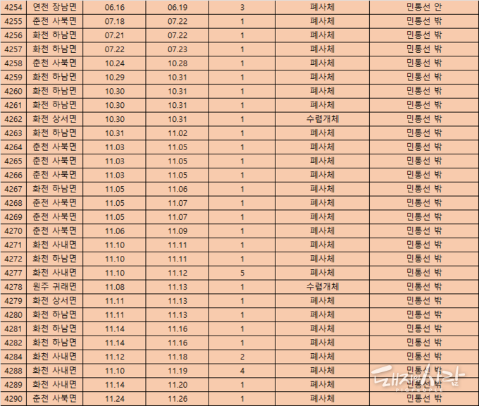 - 강원 19건: 화천 4(상서면/'20.10.9/10.10, 하남면/'23.09.25, 사내면/'24.10.13), 영월 1(주천면/'21.5.5), 고성 1(간성읍/'21.8.8), 인제 2(인제읍/'21.8.16, 남면/'21.10.6), 홍천 3(내촌면/'21.8.26, 화촌면/'22.5.26, 남면/'24.11.03), 양구 1(국토정중앙면/22.8.18), 춘천 2(동산면/22.9.19/9.20), 철원 4(동송읍/'22.11.09, 동송읍/'23.1.11, 갈말읍/'23.7.18/'24.5.21), 양양 1(손양면/'23.2.12)