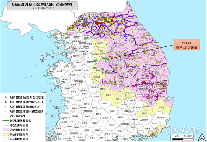 ◈ASF 확진 및 의심농가 위치(주황색: 사육돼지 발생, 보라색: 감염멧돼지, 파란색: 최근 1개월간 추가 양성멧돼지)