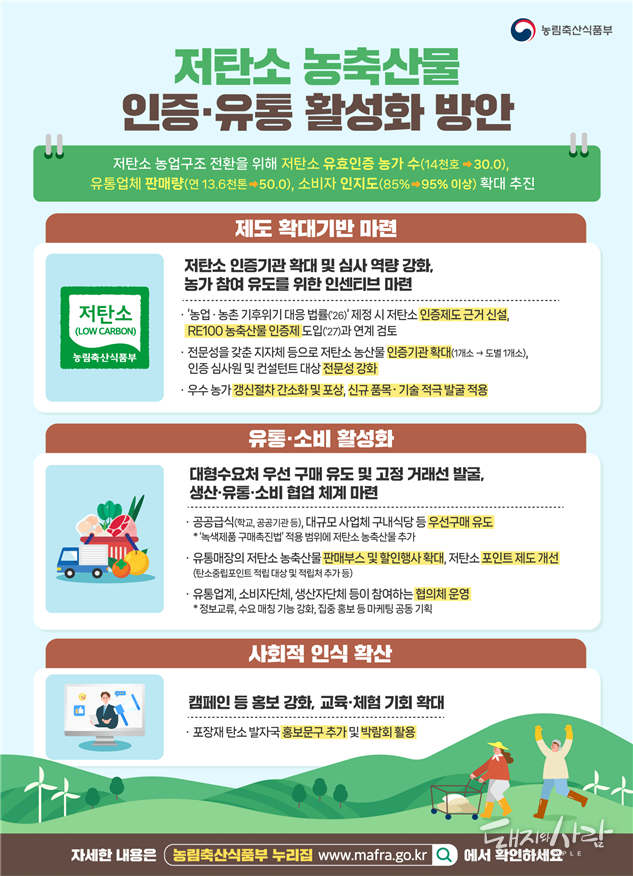 박정훈 동물복지환경정책관은 “저탄소 농축산물 인증제는 농가의 자발적인 탄소 감축 노력을 제도적으로 뒷받침하고, 소비자에게는 안전하고 지속가능한 먹거리를 제공하는 중요한 기반”이라며, “앞으로 제도적 기반을 강화하고, 판로 지원과 홍보를 강화하여 저탄소 농축산물 소비가 안정적인 공급 확대로 이어질 수 있도록 하여 우리 농업의 새로운 기회로 자리 잡을 수 있도록 노력하겠다”라고 전했습니다.