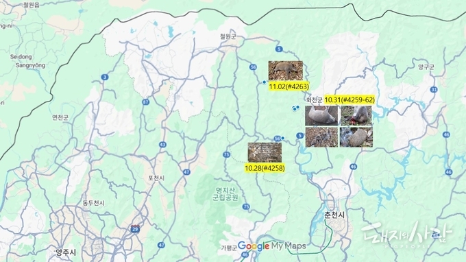 앞서 지난 28일 강원도 춘천(관련 기사)에서 1마리(#4258)에 이어 31일 화천(관련 기사)에서 4마리(#4259-62)가 확인된 바 있습니다. 대부분 죽은 상태로 발견되었으나 화천 1마리(#4262)는 살아있는 상태로 총기포획되었습니다. 이들 멧돼지 발견지점과의 거리는 최대 15km 내입니다.