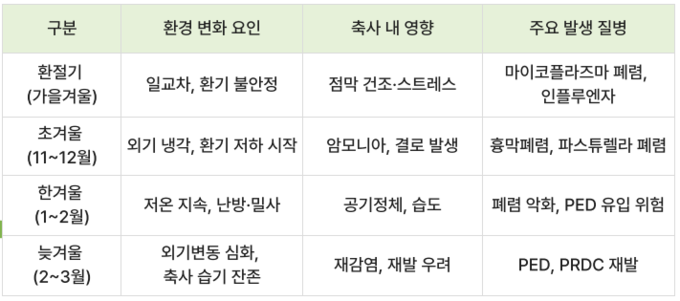 가을에서 겨울로 넘어가는 환절기에는 낮과 밤의 기온차가 커지고, 돈사 내부 환기가 불안정해지면서 호흡기 질병이 서서히 증가하기 시작한다. 온도가 더 내려가 본격적인 겨울로 접어들면, 외부의 찬 공기를 막기 위해 환기를 줄이게 되고 그 결과로 축사 안의 이산화탄소, 암모니아, 습도가 함께 높아진다.