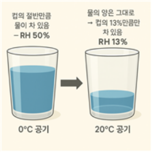 공기를 하나의 컵으로 비유해보면 이해가 쉽다. 찬 공기일수록 컵의 크기가 작고, 따뜻할수록 컵이 커진다. 예를 들어, 겨울 외기(0℃, 상대습도 50%)는 작은 컵에 물이 절반정도 찬 상태다. 그런데 이 공기가 돈사 내부(20℃) 로 들어오면, 컵의 크기는 두 배 이상 커지지만 물의 양은 그대로다. 즉, 컵은 커졌는데 물은 그대로니, 상대습도는 50% → 약13% 수준으로 급격히 떨어진다. 이렇게 내부 공기가 마르면 돼지의 비강점막이 쉽게 건조해지고, 호흡기 방어능력이 약화되어 호흡기 질병의 위험이 커진다.