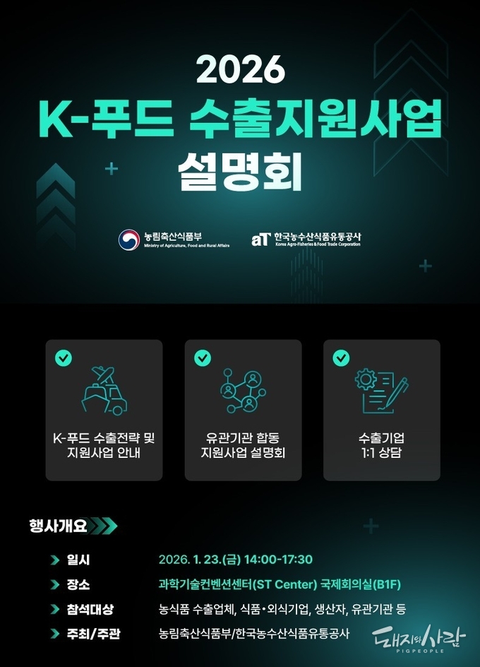 농림축산식품부(장관 송미령, 이하 농식품부)가 K-푸드의 글로벌 진출 확대를 위해 전년보다 900억원 증가한 7,070억원 규모의 2026년 K-푸드 수출지원사업 설명회를 오는 23일(금) 서울 과학기술컨벤션센터에서 개최합니다.