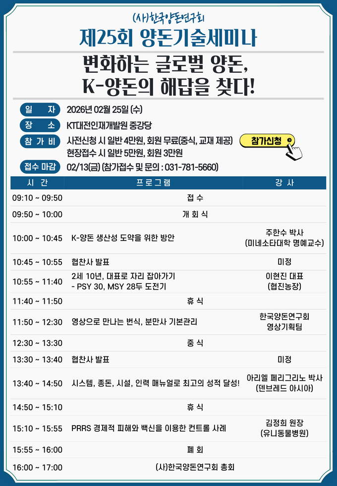 한국양돈연구회(회장 안근승)가 오는 2월 25일(수) 대전에서 '제25회 양돈기술세미나’'를 개최합니다. 올해 세미나 주제는 '변화하는 글로벌 양돈, K-양돈의 해답을 찾다!’'로, 생산성 향상 전략부터 번식·분만사 관리, PRRS 대응 사례까지 현장 적용 중심의 프로그램으로 구성됐습니다.