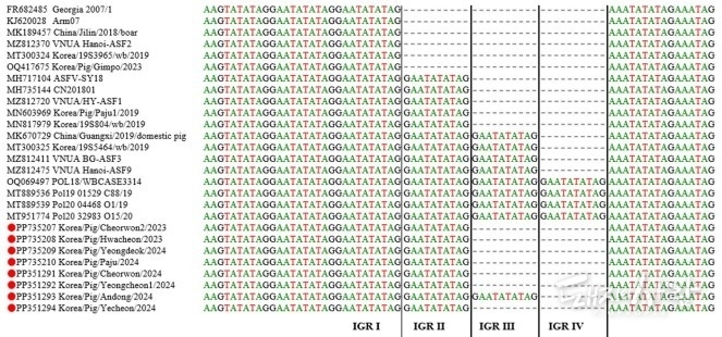 ※ 역자 주: 최근 ASF 바이러스와 관련해 IGR(Intergenic regions)이 관심 단어입니다. IGR은 바이러스의 유전자와 유전자 사이에 단백질을 코딩하지 않는 부위를 말합니다. ASFV 연구에서는 이 부위의 염기서열 반복 횟수 등을 분석해 바이러스의 유입 경로와 유전형 변이를 추적하는 '유전적 마커'로 자주 활용됩니다(참고 논문). IGR 변이가 있다고 해서 반드시 바이러스가 더 강해지거나 약해졌다고 단정할 수 없습니다.