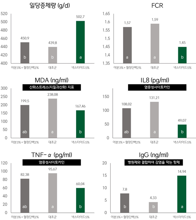 그 결과 넥스타이드 첨가는 일당증체량(ADG)에서 502.7 g을 기록하여 어분 및 혈장단백 처리구(450.9 g)와 대조구(439.8 g) 대비 유의적으로 높은 성장 성적을 나타냈다. 반면 사료요구율(FCR)은 1.45로 나타나 다른 처리구(1.57, 1.59) 대비 개선된 결과를 보였다.