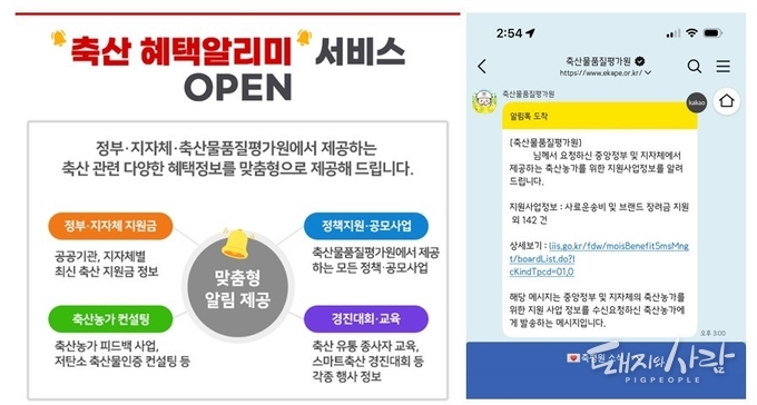 축산물품질평가원(원장 박병홍)은 지난 9일부터 축산농가와 이해관계자가 정부·지자체 지원사업 및 축산 관련 안내 등의 정보를 맞춤형으로 받아볼 수 있는 ‘축산 혜택알리미’ 서비스를 본격 개시했다고 최근 밝혔습니다.
