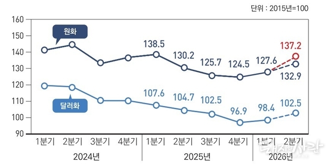 2분기 사료용 곡물 수입단가지수는 132.9로 예측되었습니다. 이는 지난 1분기(127.6) 대비 4.2% 상승한 수치입니다. 그런데 여기서 주목할 점은 시장의 실제 체감 지수가 훨씬 높을 수 있다는 것입니다. 로이터(Reuters) 등 시장 컨센서스를 반영할 경우, 사료용 곡물 수입단가는 전 분기 대비 최대 137.2(7.5%)까지 급등할 것으로 분석되었습니다. 원화 약세와 유가 상승이 겹치면서 수입 원가가 예상보다 가파르게 오르고 있기 때문입니다.