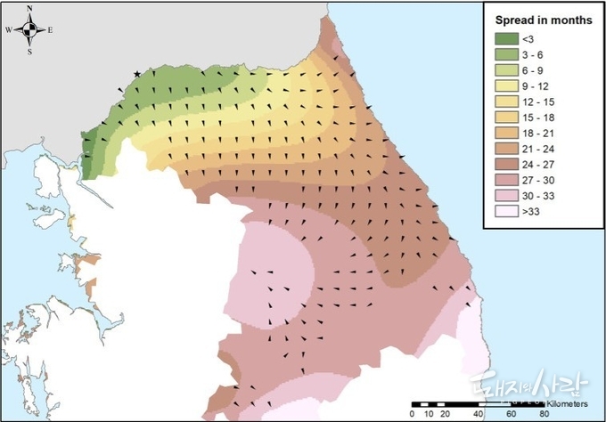 [논문 원문(바로보기), Estimating the velocity and direction of African Swine Fever spread in wild boar populations in South Korea using Trend-Surface Analysis, Cecilia Aguilar-Vega(University of Madrid), PLoS One, 2026]