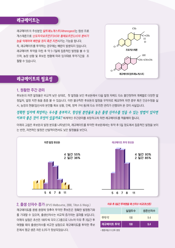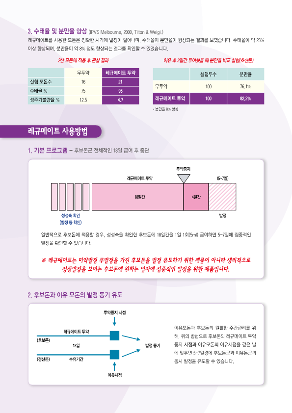 까다로운 후보돈의 번식! '레규메이트'는 후보돈의 발정동기화를 유도하여, 효과적인 그룹 관리를 가능하게 합니다.