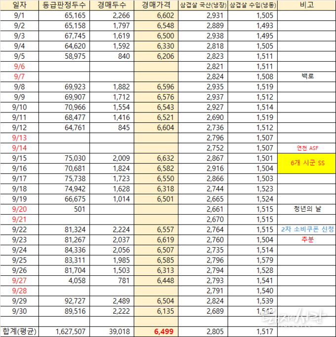 ※ 9월 22일자 주간 돼지고기 시황(출처 한국육류유통수출협회)