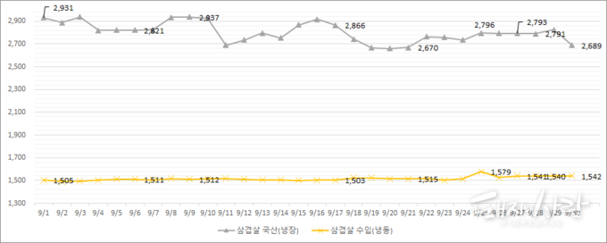 ※ 9월 29일자 주간 돼지고기 시황(출처 한국육류유통수출협회)