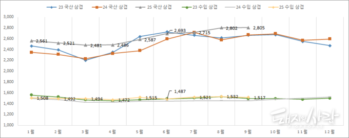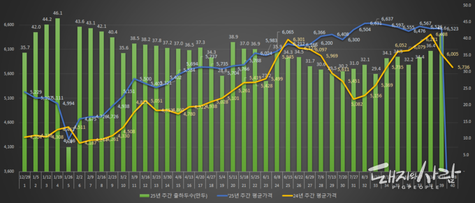 ☞2024년과 2025년 주차별 평균 돈가('24년은 같은 기간)
