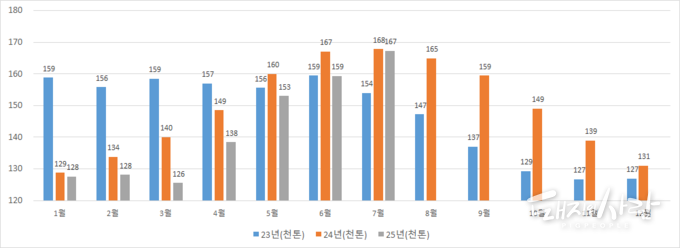 - 수입산(수입육 이력제 기반 조사, 정육): '25년 7월 기준 16만7,328천톤(전월대비 5.0%, 전년대비 -0.3%).....전년 대비 삼겹살은 12,878톤(19.9%) 감소, 앞다리는 5,875톤(8.0%) 증가