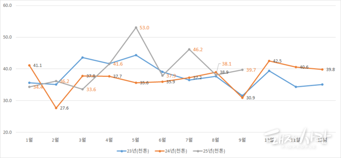 - '25년 9월 쇠고기 수입량 4만톤(전월대비 4.3%, 전년대비 28.4%)
