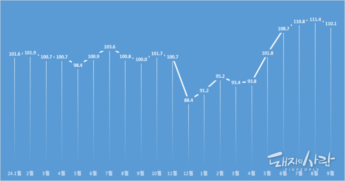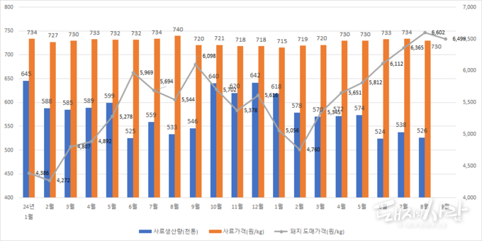 - '25년 8월 양돈용 배합사료 평균 가격 730원/kg(전월대비 4원 하락, 전년대비 10원 하락)