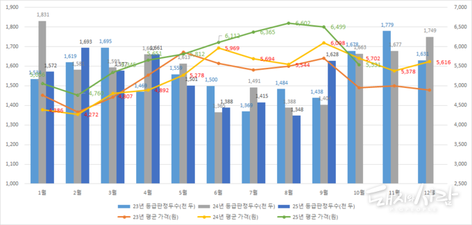 ☞월별 등급판정두수(단위 천두) 및 평균 가격(단위 원)@돼지와사람 편집